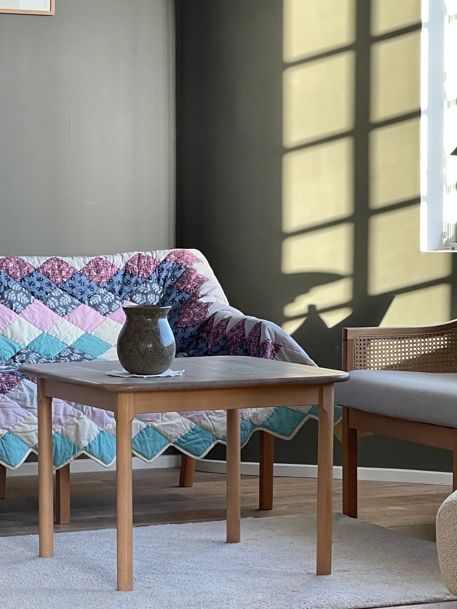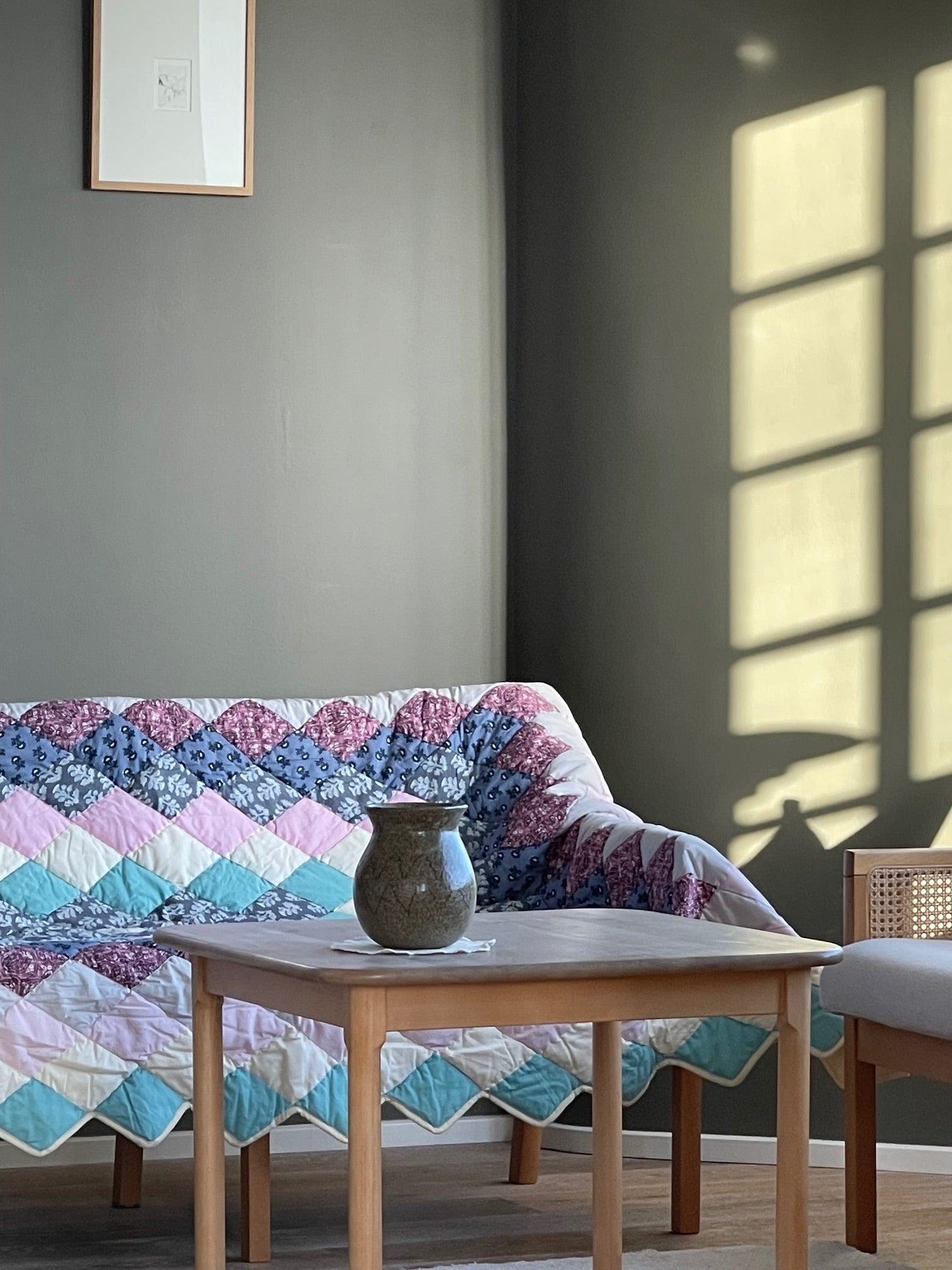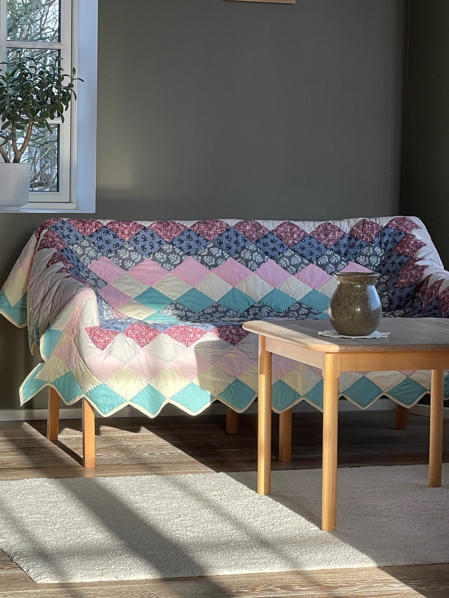 Dette smukke patchwork tæppe er designet af Line Meldgaard Hviid og håndsyet af smukke restmetervarer på vores systue i Indien.