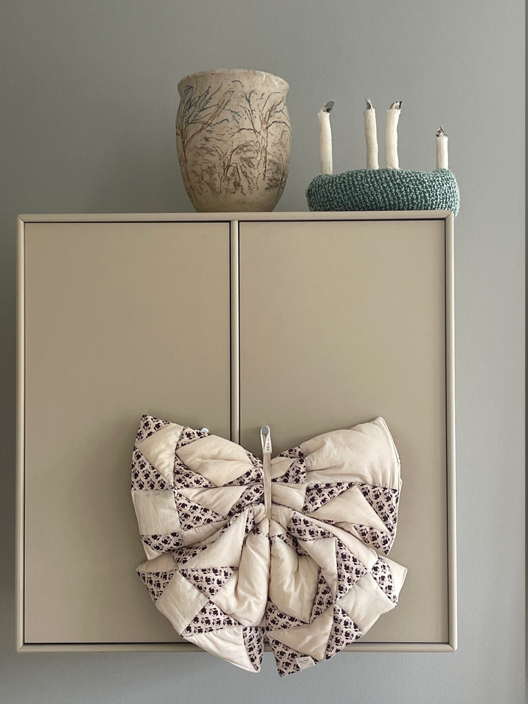 Sløjfen har en cremefarvet bund med mørkt auberginefarvet mønster. Den kan hænges op på kaminen, på døren eller et andet sted, hvor den spreder glæde og hygger.