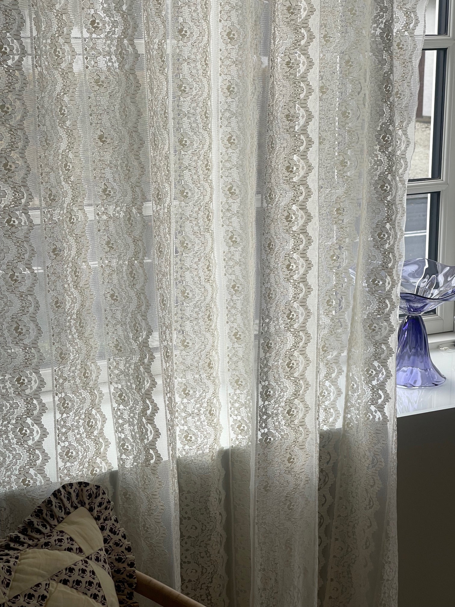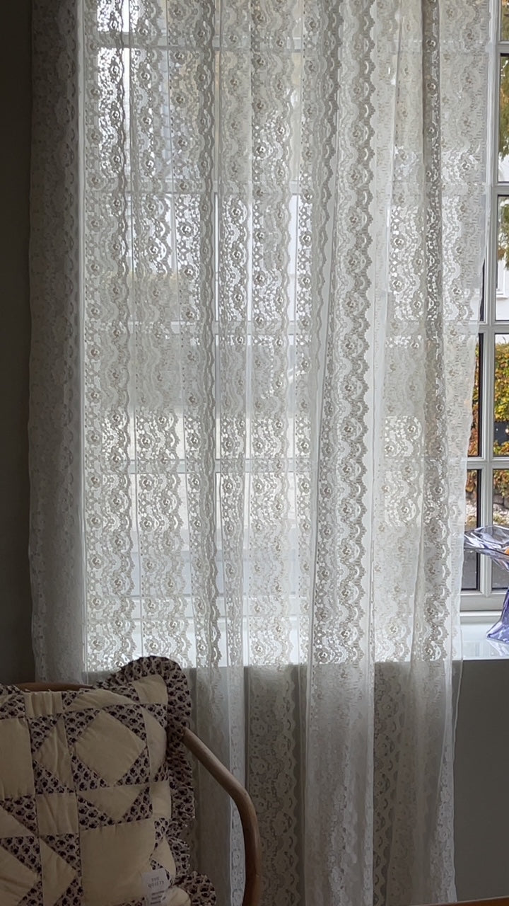This beautiful cotton lace curtain can be used in the window, as a beautiful room divider, fitting room curtain or whatever you can imagine.