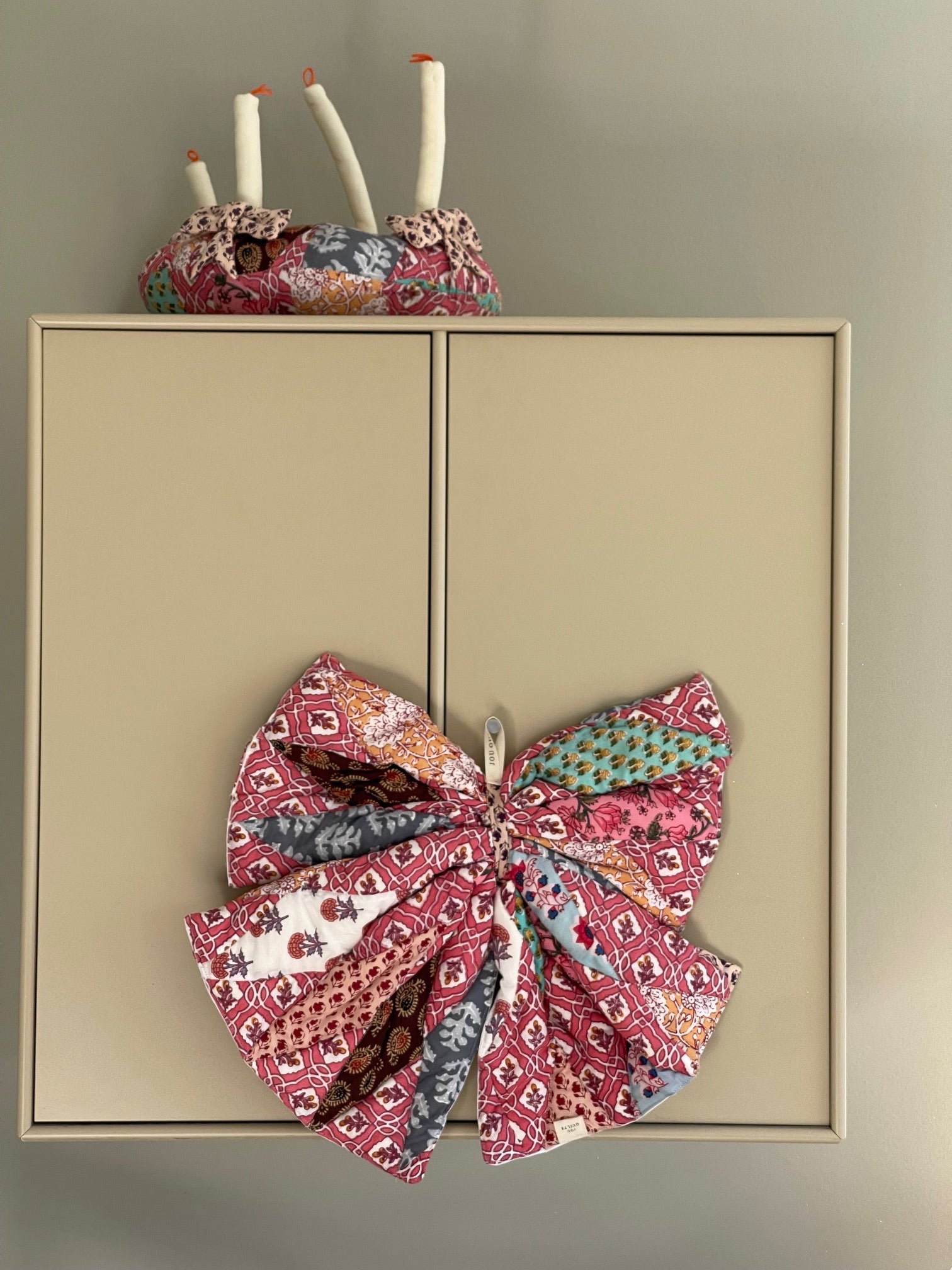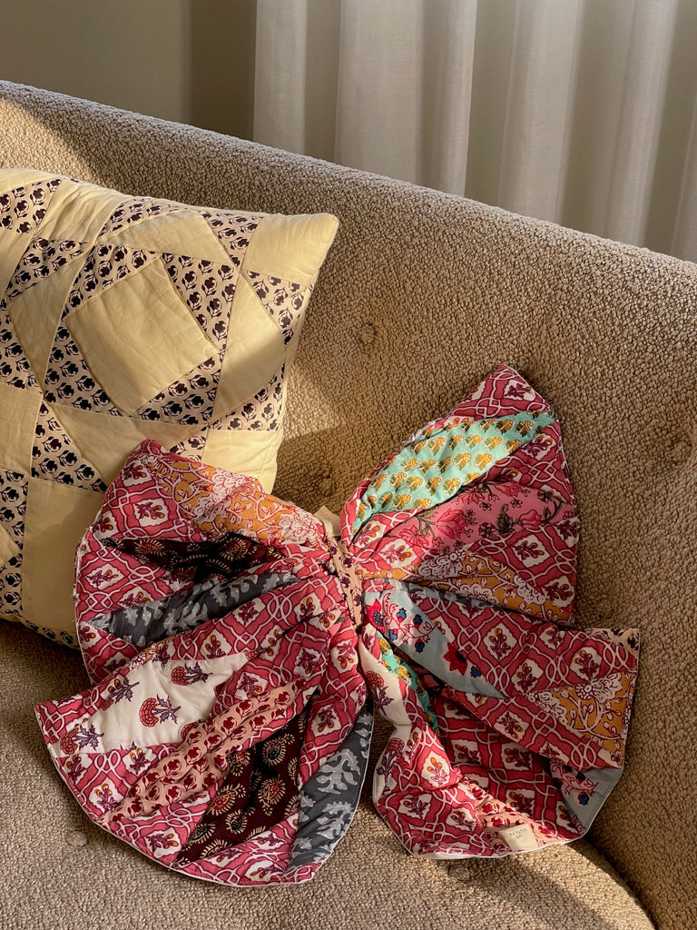 Denne fine patchwork sløjfe er designet af Line Meldgaard Hviid og håndsyet af smukke restmetervarer på vores systue i Indien.