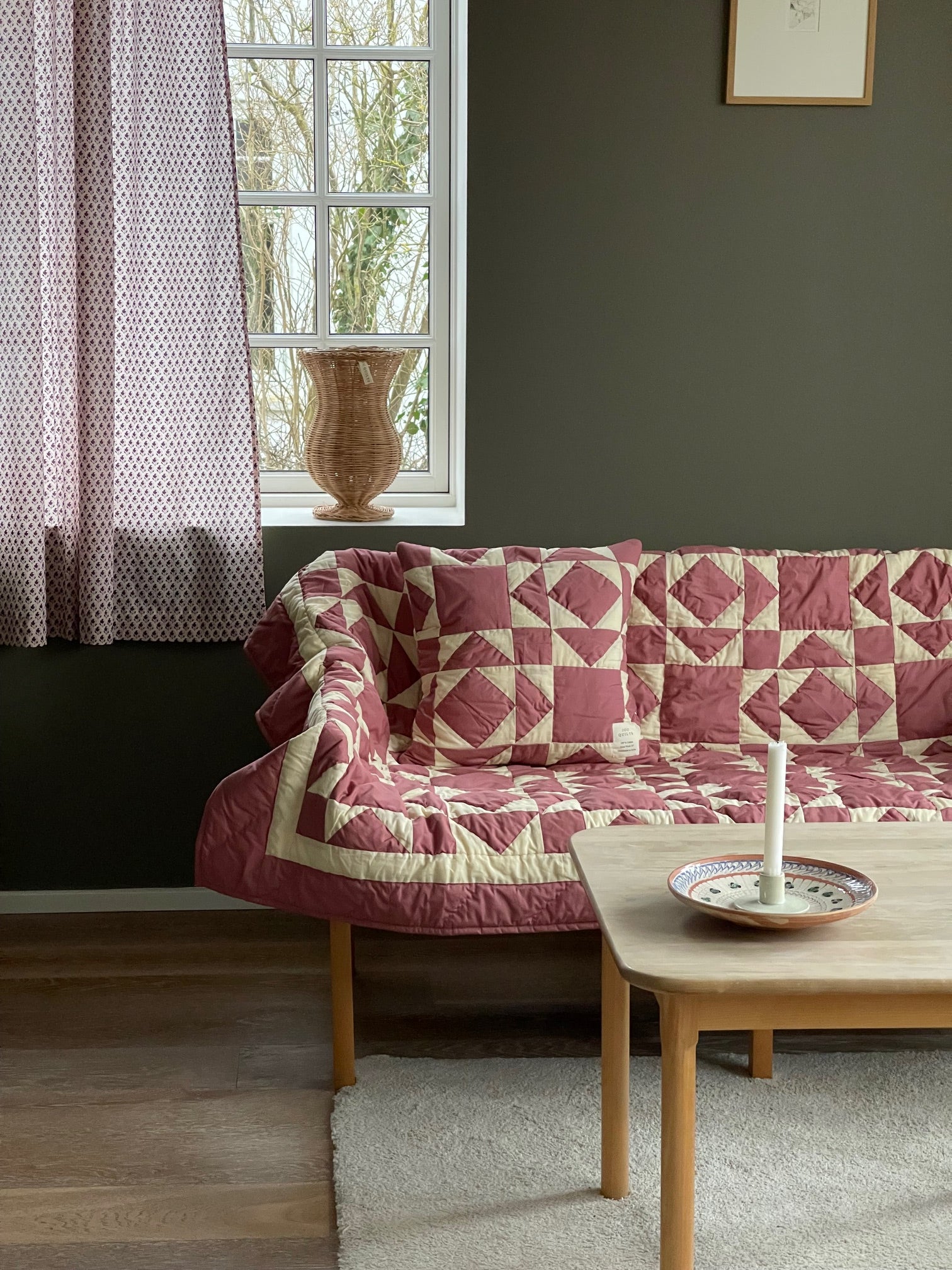 Dette smukke patchwork tæppe er designet af Line Meldgaard Hviid og håndsyet af smukke restmetervarer på vores systue i Indien.