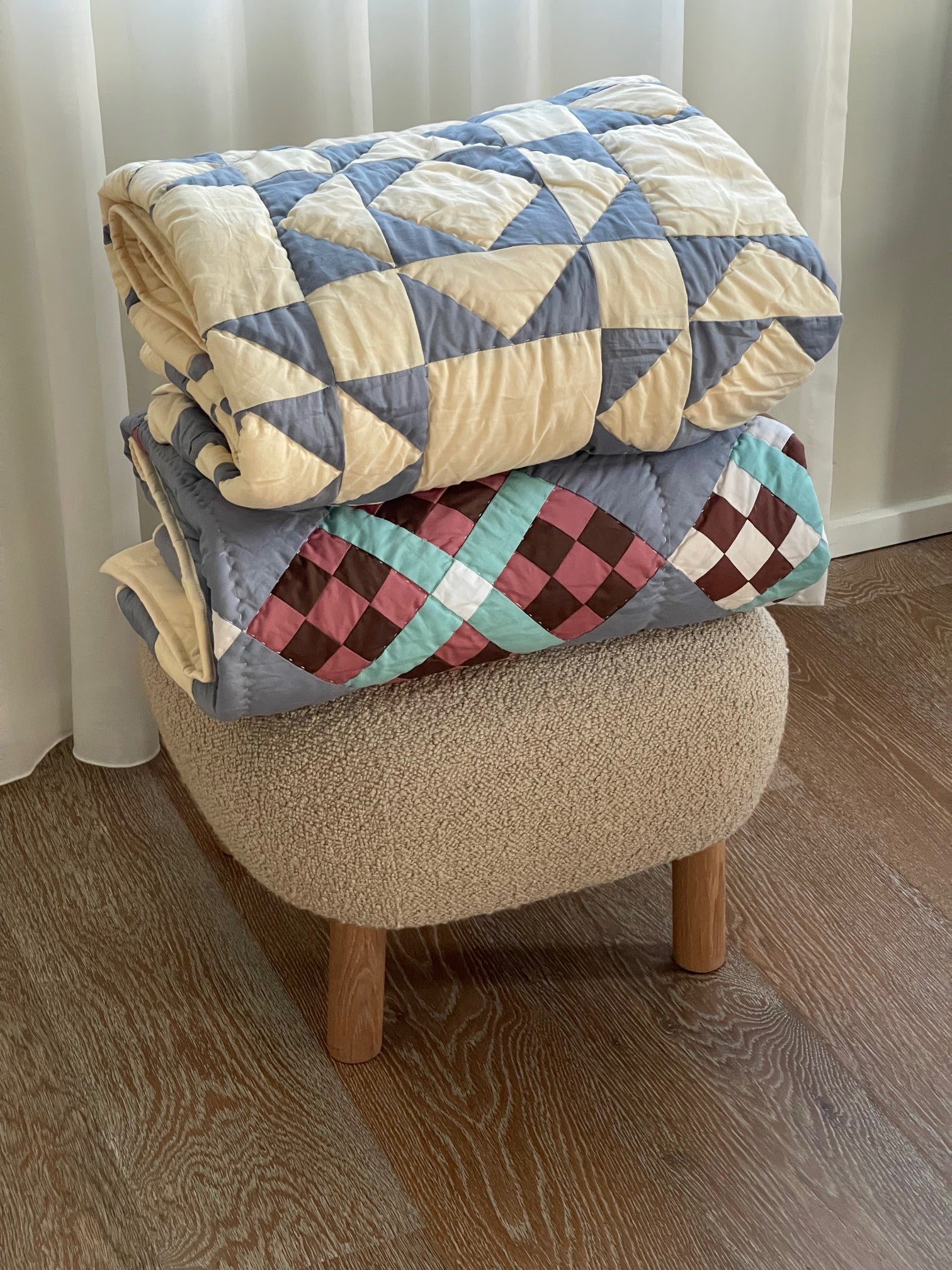 Dette smukke patchwork tæppe er designet af Line Meldgaard Hviid og håndsyet af smukke restmetervarer på vores systue i Indien.
